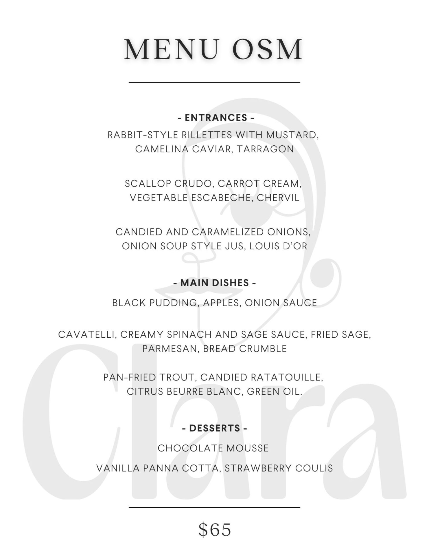 Le Clara offers a specially designed $65 menu for OSM guests.