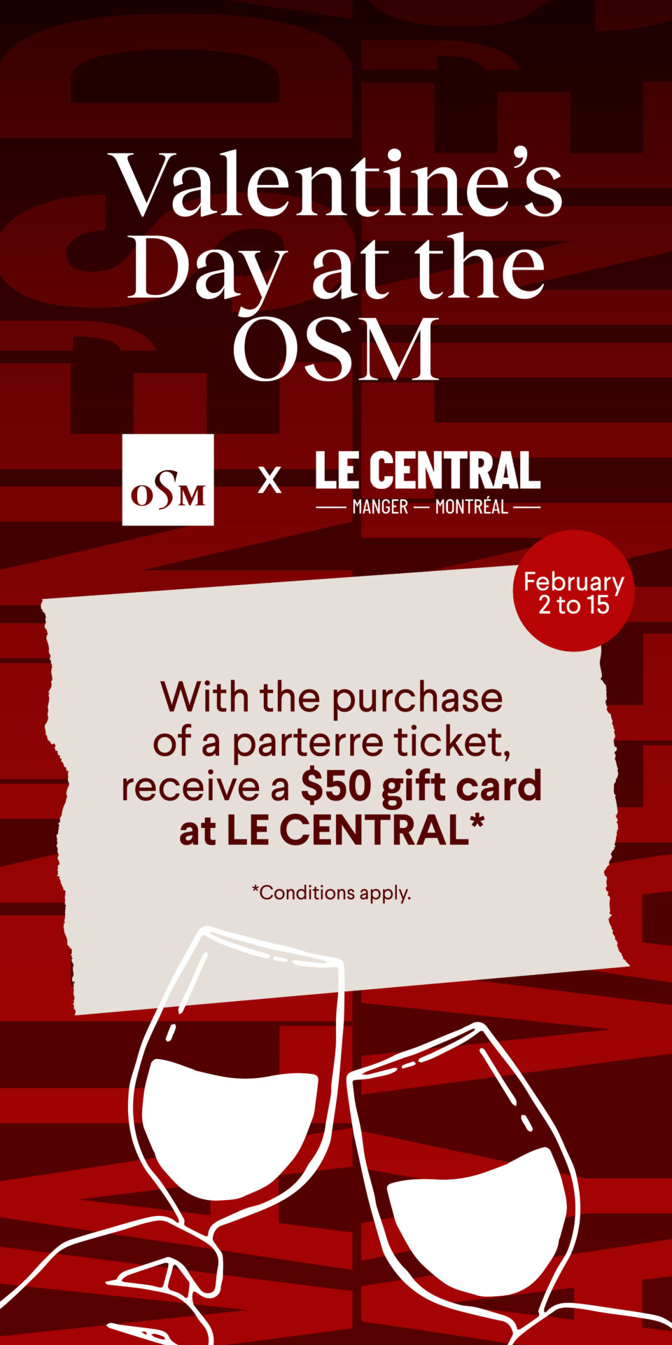 With the purchase of a regular-price ticket in the Parterre section (Prestige 1 or 2 categories), receive a $50 gift card, redeemable at any of the 16 restaurants of Le Central. Start off your evening with a delicious meal in vibrant surroundings, then finish it on a high note at the Maison symphonique with a memorable musical performance.