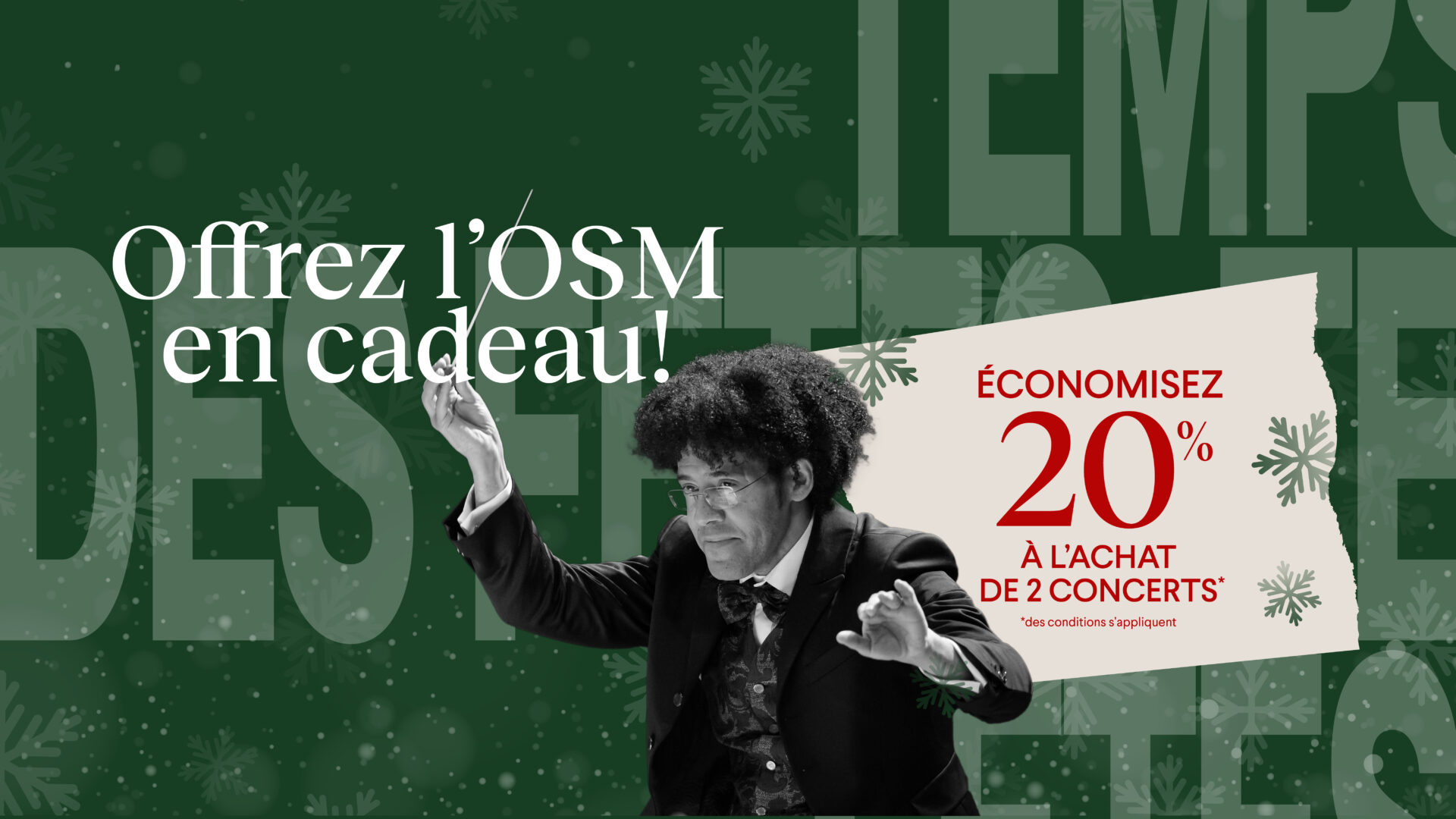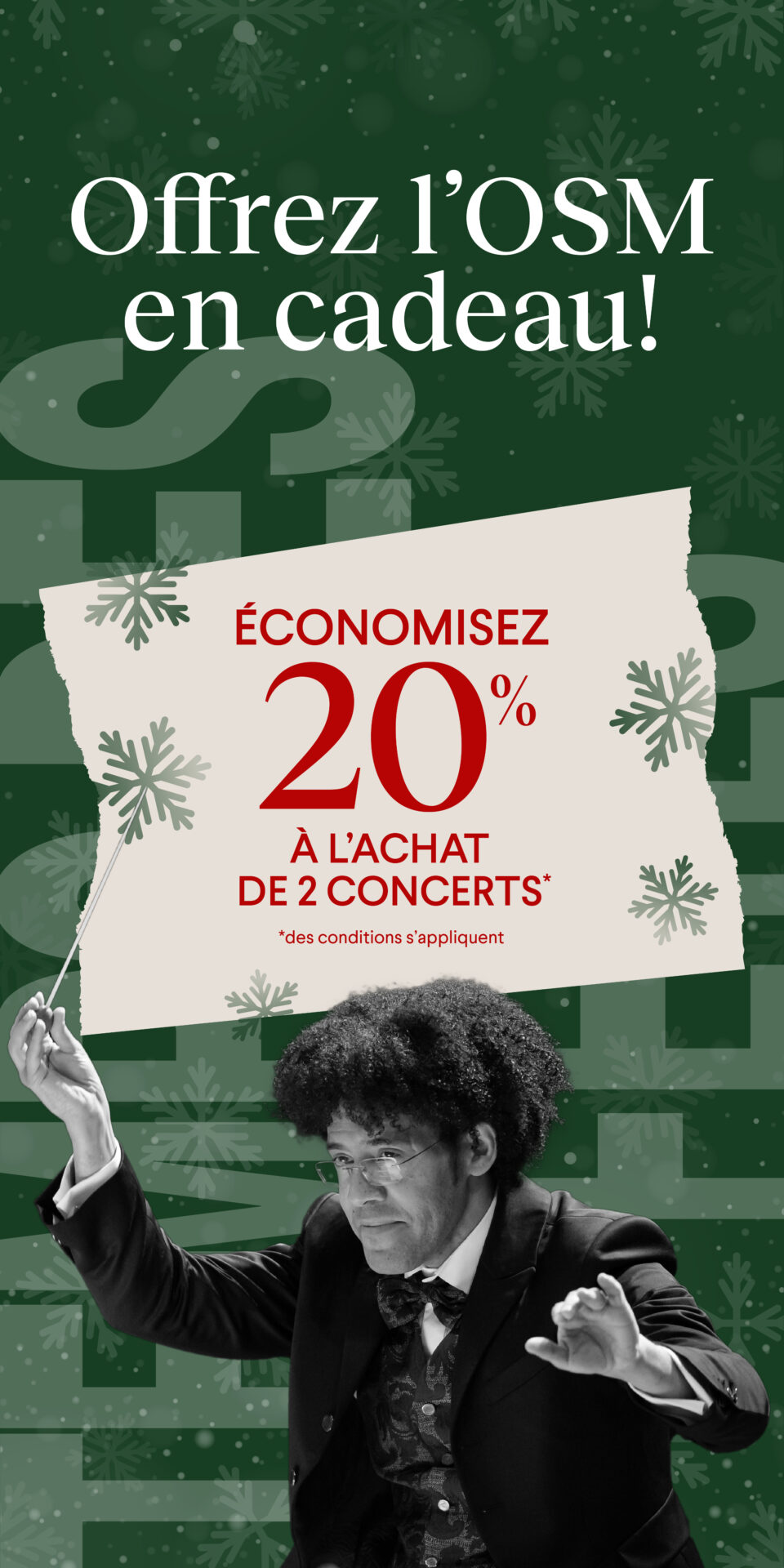 À la recherche d’un cadeau pour quelqu’un qui aime tout essayer ? Ce forfait est parfait pour combler tous les types d’intérêts! De la richesse du répertoire classique de Lopez, Childs, Mahler et Mozart ou de l’incontournable Requiem Allemand, passant par la musique de film du célèbre Harry Potter et à nos soirées Apéro, faites découvrir toute la palette musicale de l’OSM avec ces concerts.